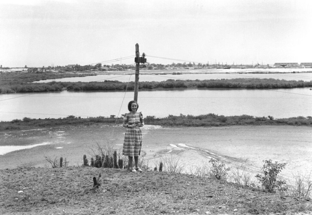 Detrás de ella hay un poste de electricidad, estructura endeble y difusa, que no distrae la atención de la mujer ni del agua quieta que enmarca la fotografía.